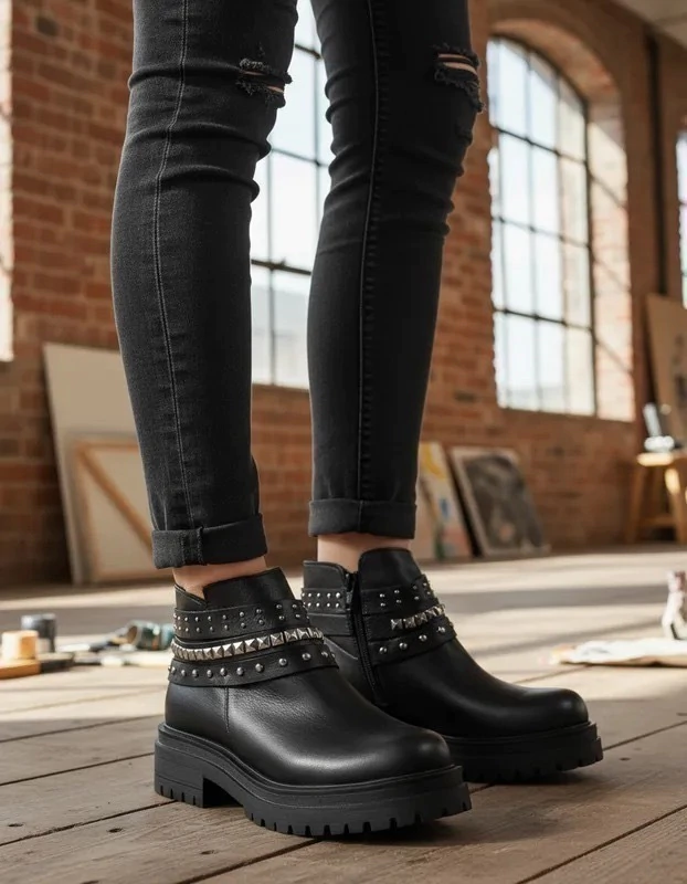 Detalles de Tachitas en el Contorno: Aportan un toque de originalidad y carácter a la bota.